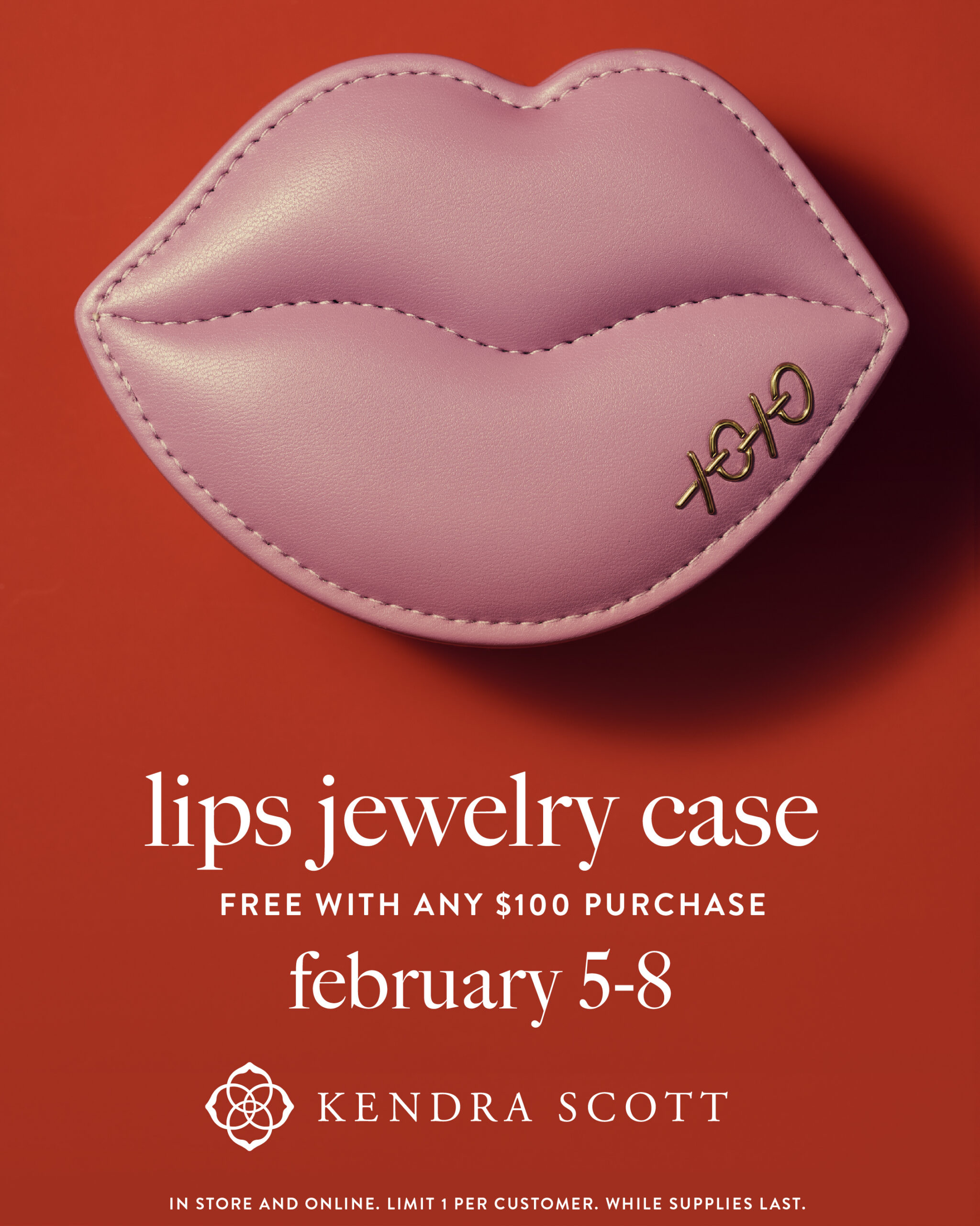Free Kendra Scott Lips Jewelry Case with any $100 purchase on February 5-8. Valued at $55. Limit 1 per customer, while supplies last.