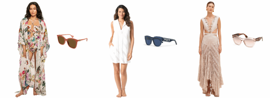 Paris Optique – Curated luxury eyewear from iconic brands to elevate your vacation aesthetic. (Pictured: Gucci GG Sunglasses, Dior Wildior Sunglasses, Tom Ford Cara Sunglasses)